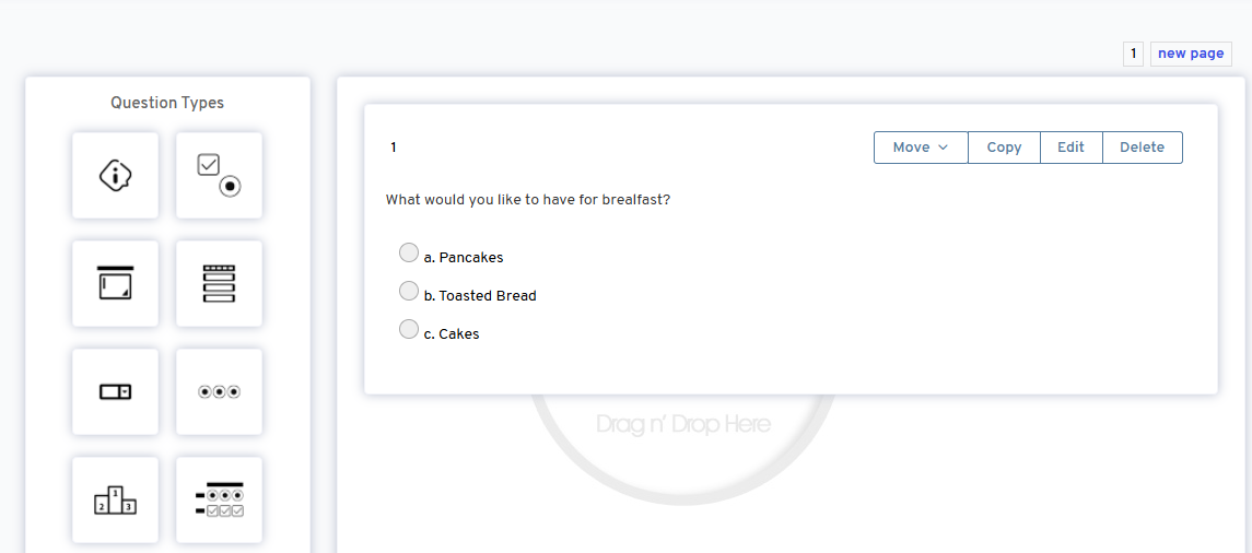 - Create a new page and drag a new question to this page.