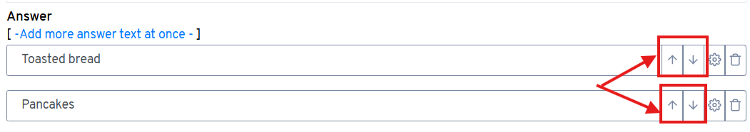 - On the answer area of the edit question modal window, click on the up or down icon on the right side of the option. This will move the option position up or down.